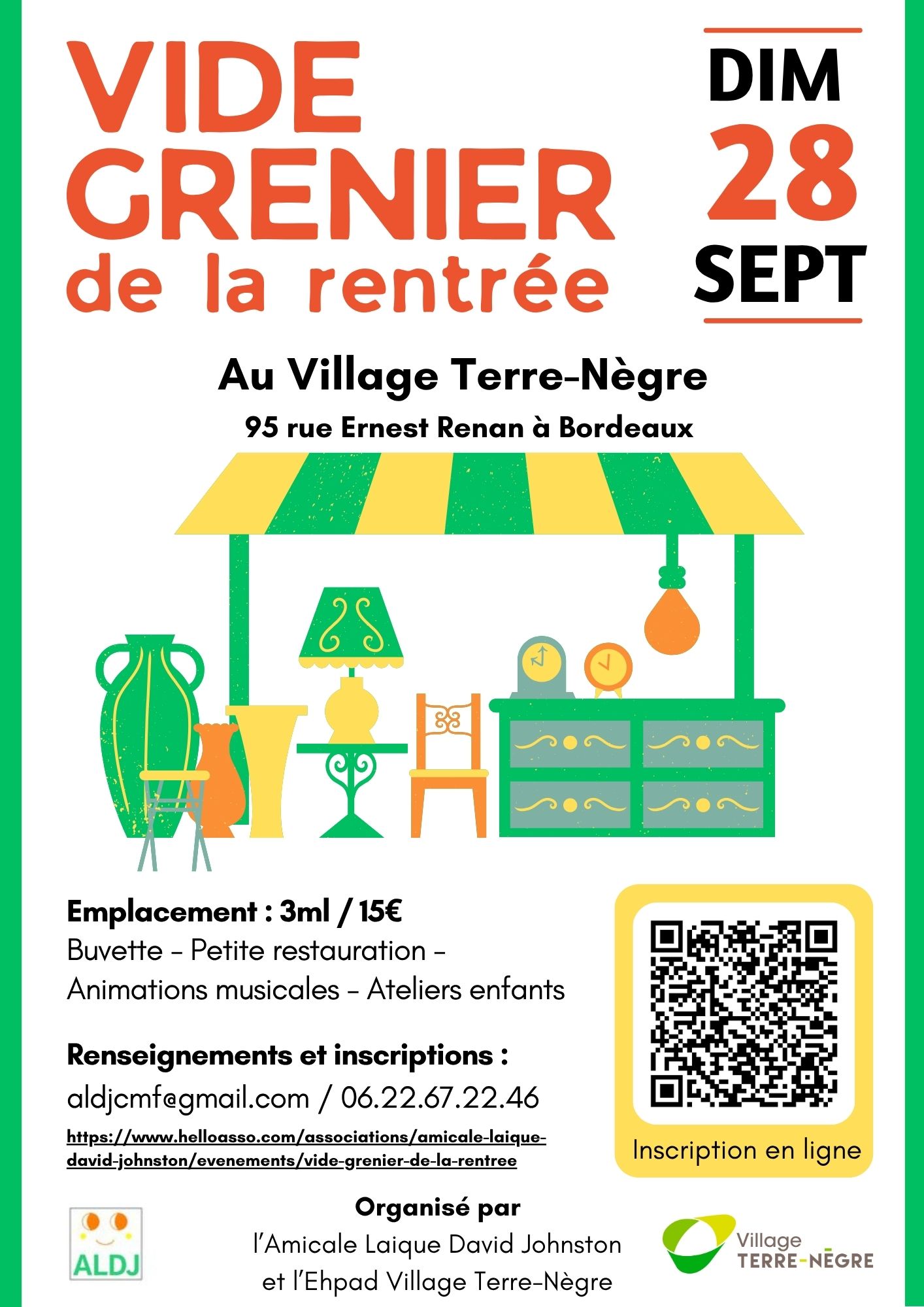 Le Village Terre-Nègre et l’association Amicale Laïque David Johnston organisent un vide-grenier dans notre parc le dimanche 28 septembre de 9h à 17h.